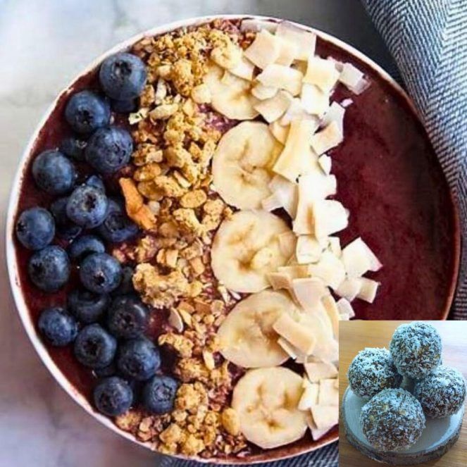 Bowl de acai con mango, fresas y arándanos, elige dos toppins entre: plátano, coco, avena, semillas y miel. Bolita energética artesanal con frutos secos, trocitos de fruta, avena, semillas, canela… A elegir entre terminación en coco o cacao.