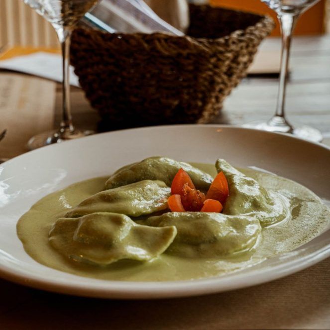 Ravioli relleno de corvina con salsa de pistacho verde y albahaca.