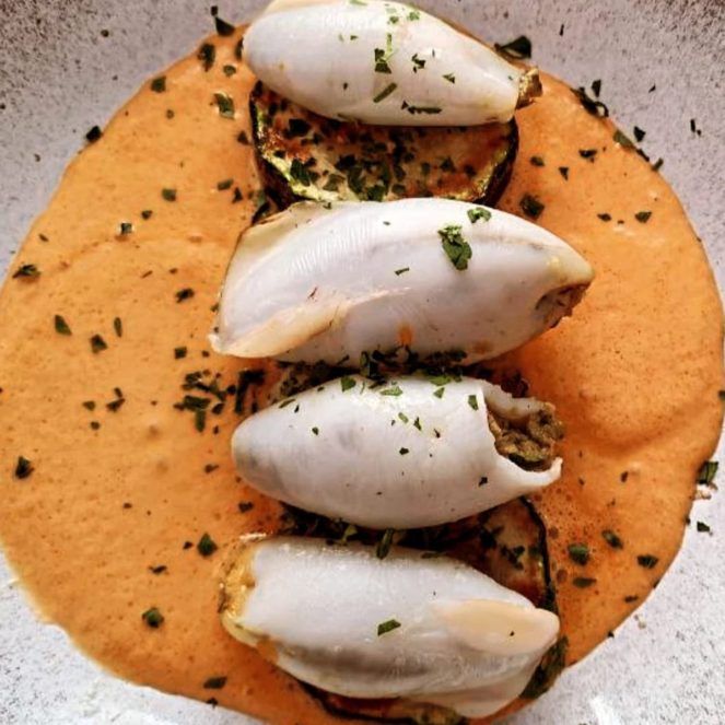 Calamares frescos al horno rellenos de calabacín y secreto ibérico sobre espuma de patata roja.