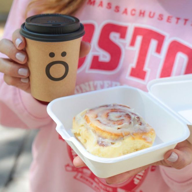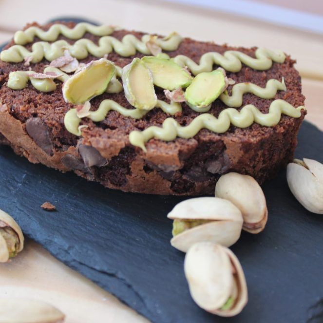 Brownie con crema y trozos de pistacho, disponible formato take away.