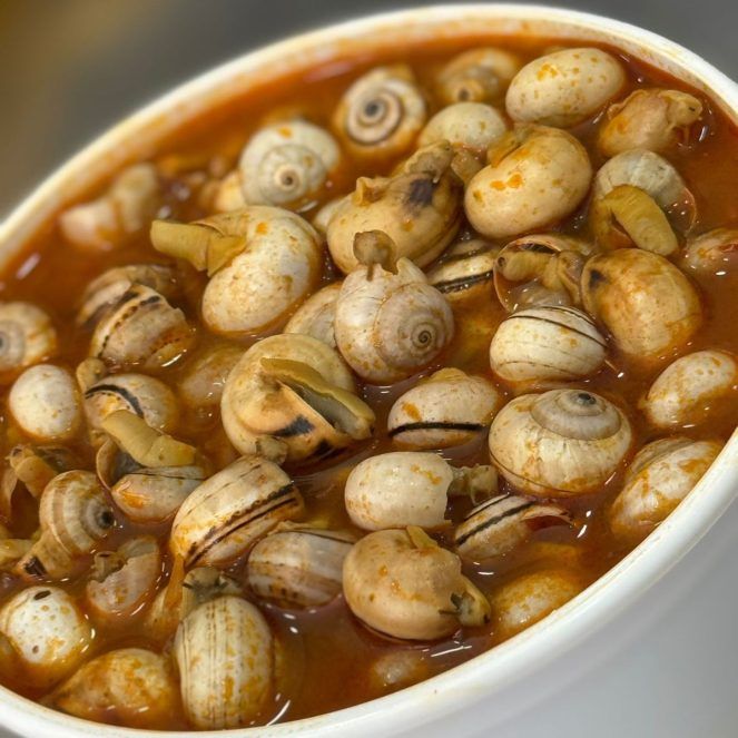 Caracoles cocinados con salsa de verduras y mezcla de especias.