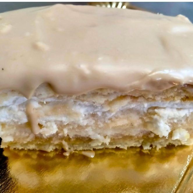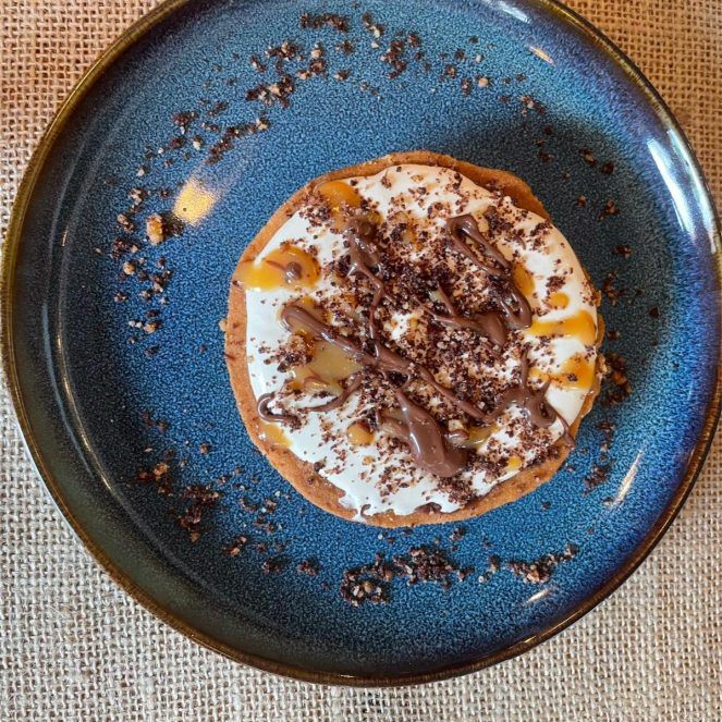 Dulce: Bizcocho de vainilla con chocolate blanco, caramelo y nuez