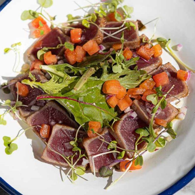 Tataki de atún sobre brotes frescos acompañado de mayonesa de ali de soja.