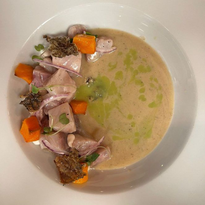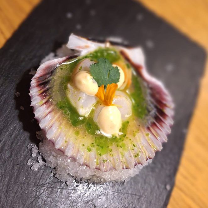 Zamburiña macerada al momento en cítricos, acompañada de una picada de perejil y puntos de mayonesa de ají amarillo. Toque ligeramente picante, al terminar hoja de cilantro fresco.