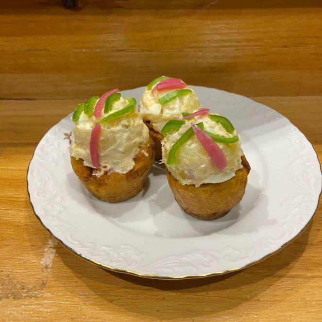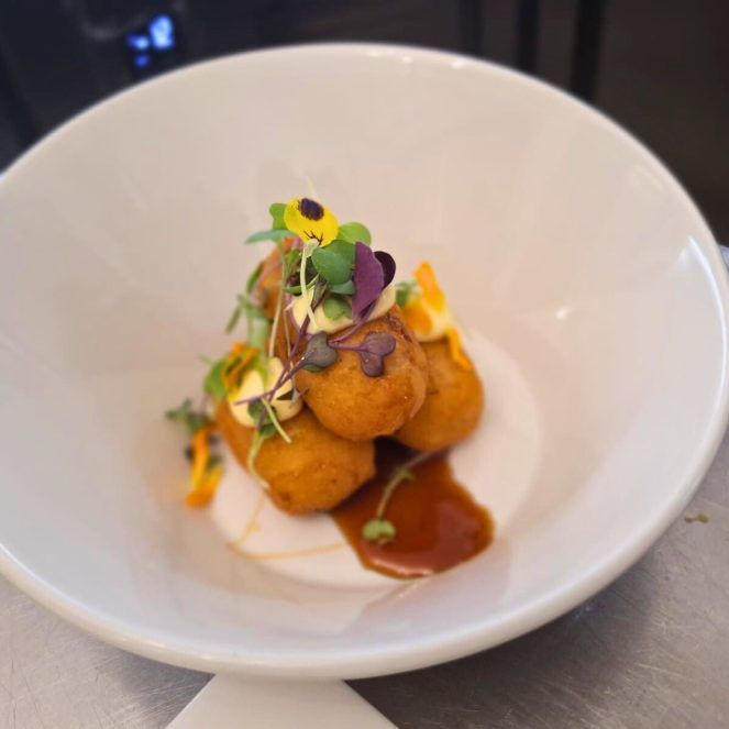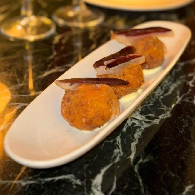 Croquetas de yuca rellenas de lomo en manteca, base de miel de oloroso y para finalizar puntos de mayonesa cítrica.