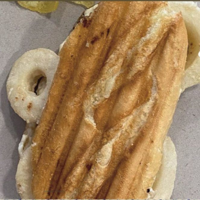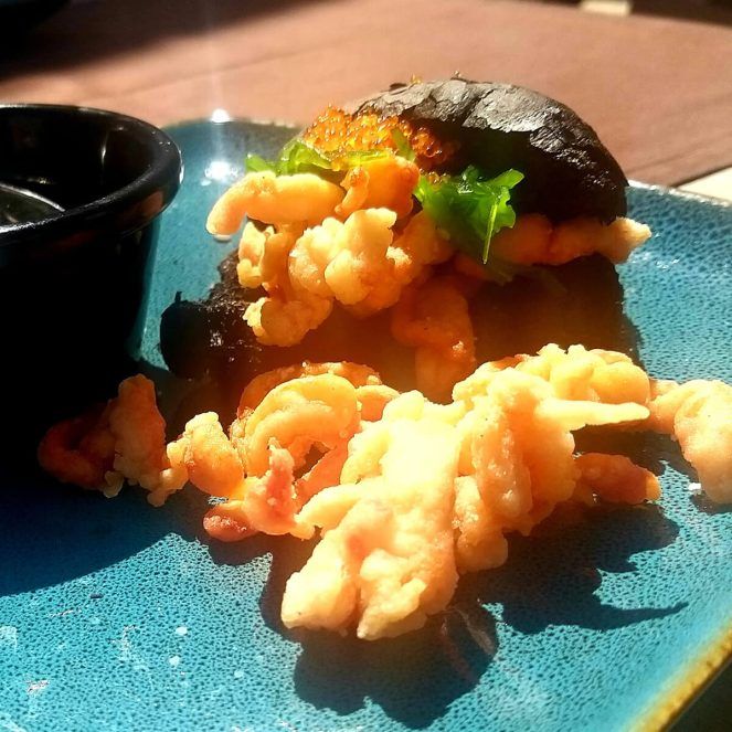 Bocata de patitas de bogavante con ensalada de algas y pan negro sin gluten acompañado de mayonesa wasabi.