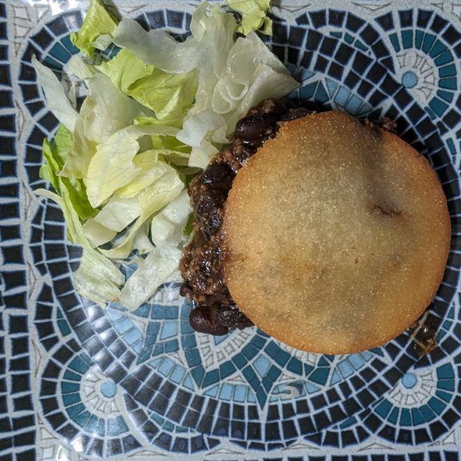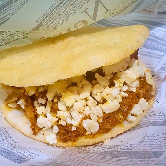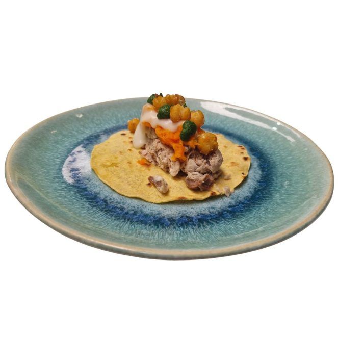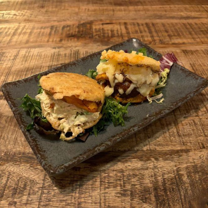 Fusión de dos culturas gastronómicas unidas en una sola, pensando en los celíacos. Una arepa de carrillada con plátano macho maduro y queso y otro sabor latino “reina pepiada”.