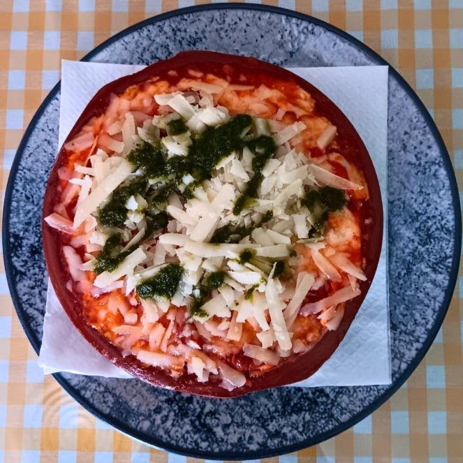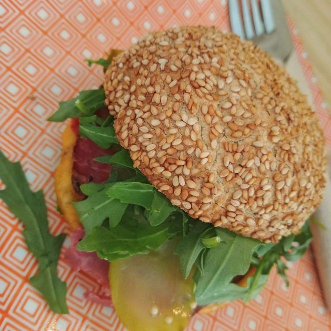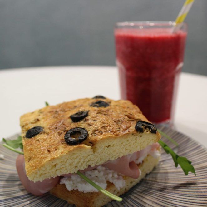 Focaccia de aceituna negra y hierbas provenzales relleno de ricotta, rúcula y mortadela siciliana. Junto con smoothie de remolacha, piña y frutos rojos.