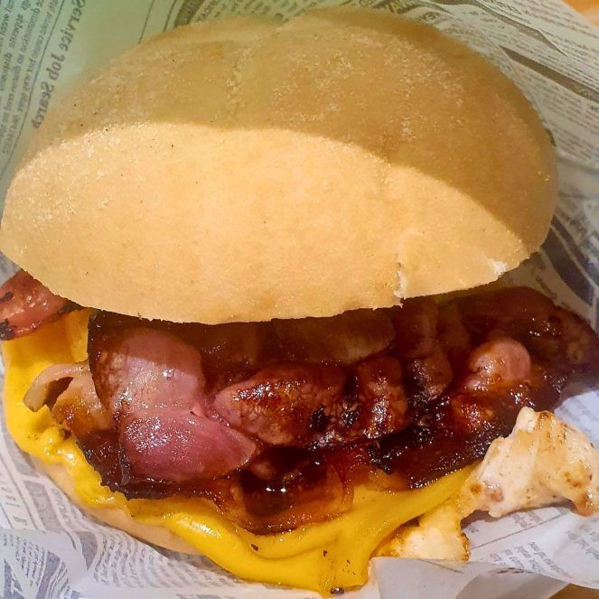 Pan sin gluten, filete de pollo a la plancha, queso cheddar, bacon y salsa a elegir
