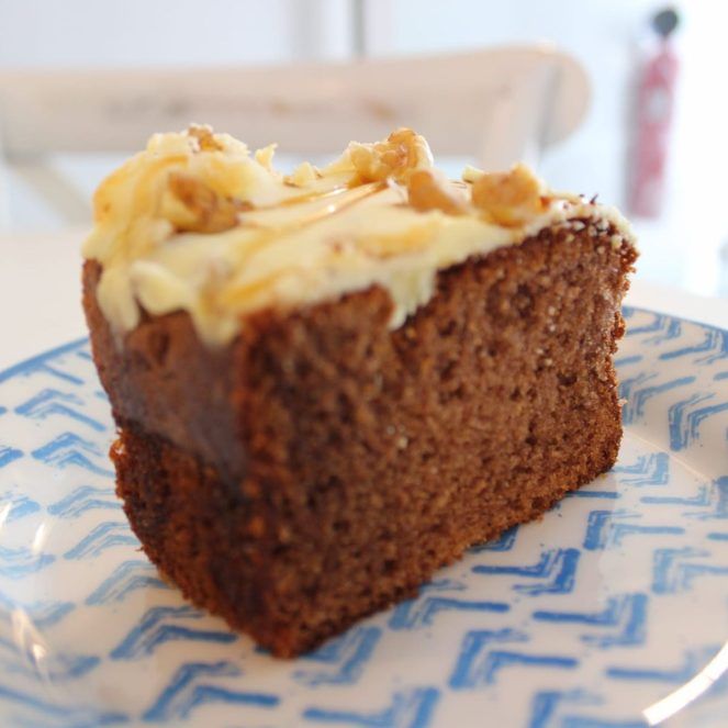 Bizcocho marmoleado mezclado con vainilla y chocolate oscuro con topping de caramelo derretido y ralladura de nueces.