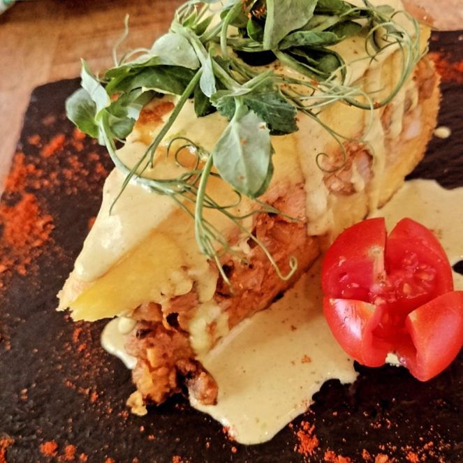 Pastel de carne con puré de patata, batata y salsa de curry. También ofrecemos una versión vegetariana.