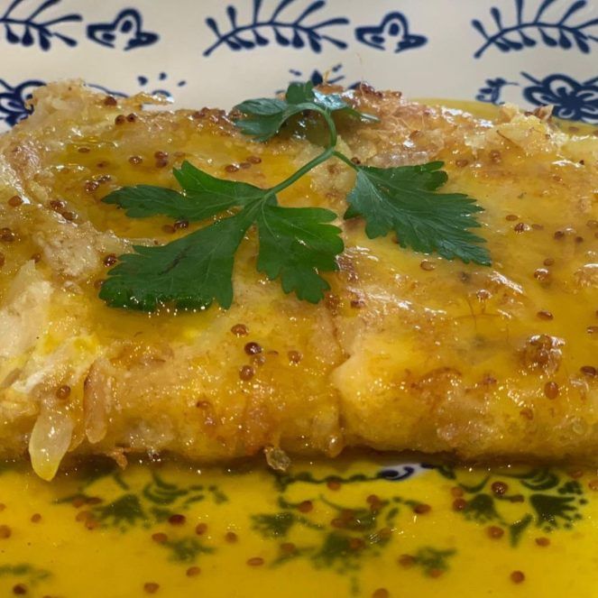 Salado: Torrija de bacalao y patatas con miel y mostaza