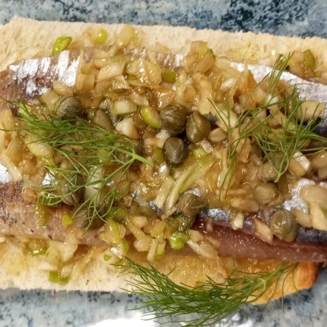 Tosta con sardina anchoada, cebolla fresca y eneldo acompañada de alcaparras.