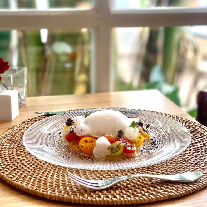 Burrata fresca, tomate cherrys, mini peras confitadas y cebollitas en vinagre.