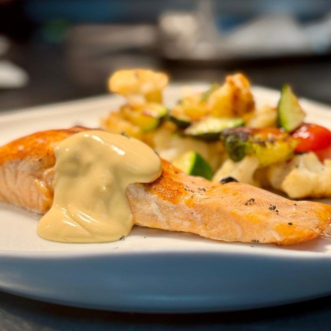 Este plato está preparado con nuestro ravioli hecho a mano y nuestra masa casera de harina de maíz, arroz y huevo. El relleno está hecho con salmón fresco, salteado con mantequilla y vino blanco. Su salsa es un curry amarillo tailandés aromatizado con hojas frescas de eneldo.
