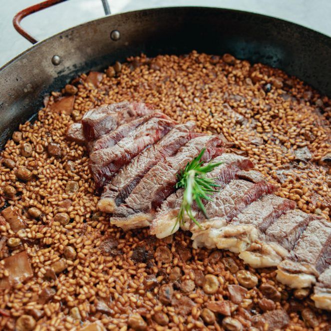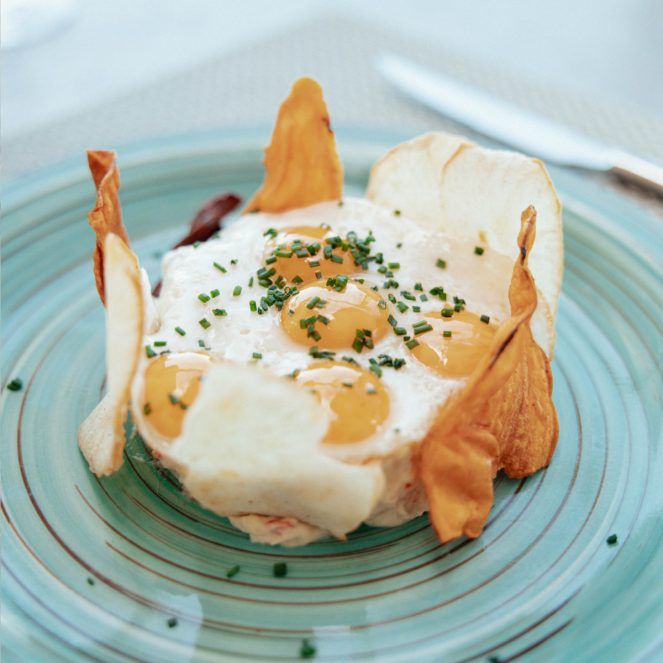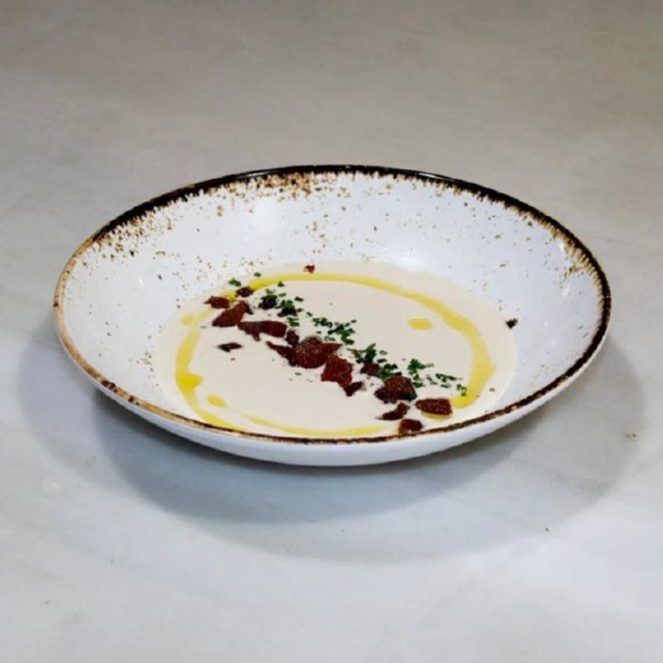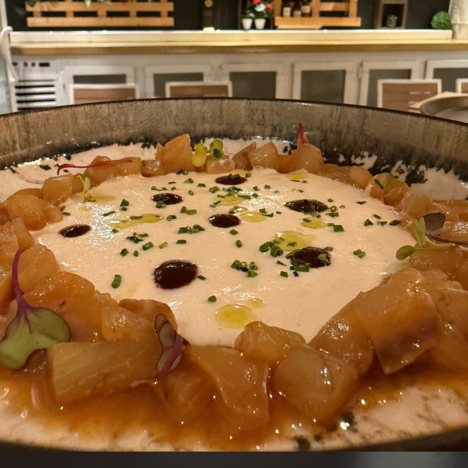 Exquisita carrillada de atún rojo de almadraba, cocinada a baja temperatura para conservar su jugosidad y sellada a fuego alto para una corteza crujiente. Servida con un fresco ajo blanco, que aporta un vibrante contraste térmico y de sabores. ¡Una experiencia única en cada bocado!
