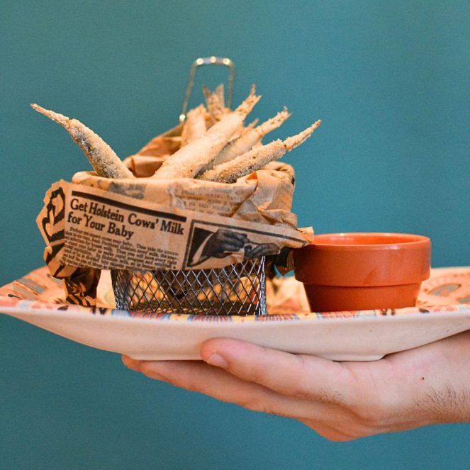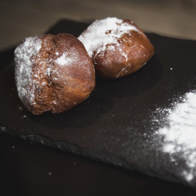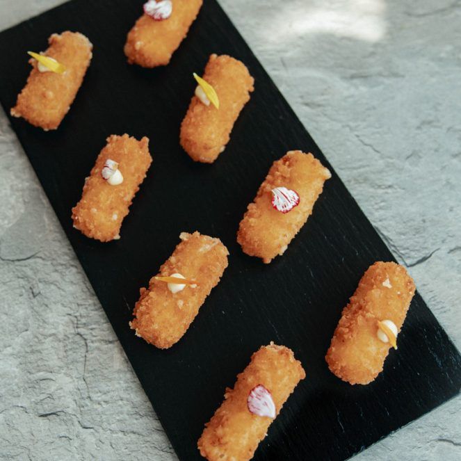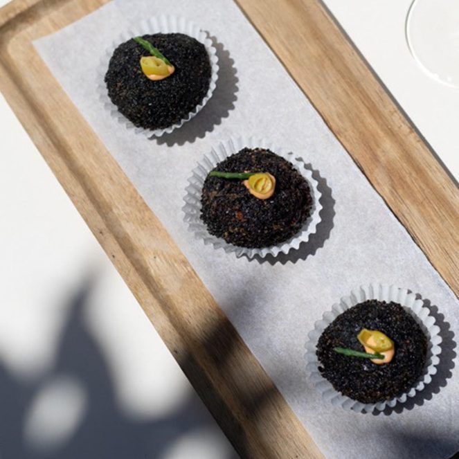 Croquetas de bacalao y arroz negro venere empanadas con un pan negro sin gluten de elaboración propia. Presentado con mayo de lima, pizarra y salicornia.