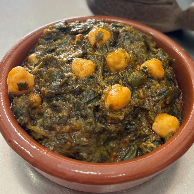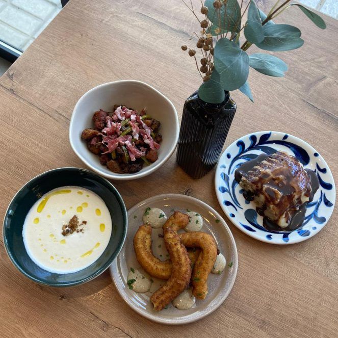 Menú compuesto por: ajoblanco, repapadillas de bacalao, migas de la ena y tarta de la abuela con base de galleta cookie.