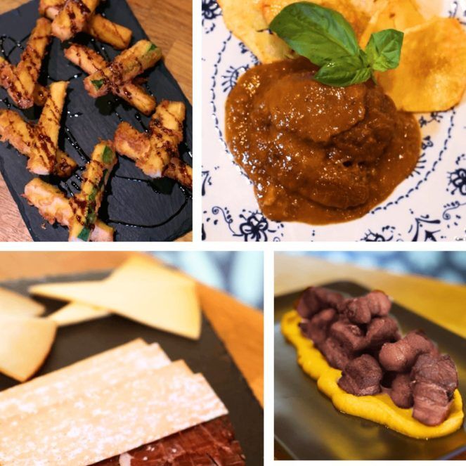 Entrantes a compartir: tabla de quesos y jamón ibérico, chicharrones sobre una cama de crema de calabazas y calabacín rebozado con miel de caña. Plato principal: carrillada ibérica acompañada de patatas panaderas. Postre: tarta de queso con frutos rojos. Incluye: 1º consumición // una botella de vino cada 4 personas incluida.
