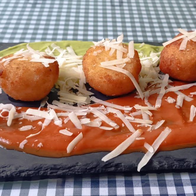 Ñoquis rellenos de queso y salsa de pesto rojo y albahaca