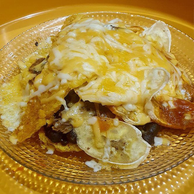 Carne de cerdo, queso y jamón acompañado de guarnición de patatas fritas