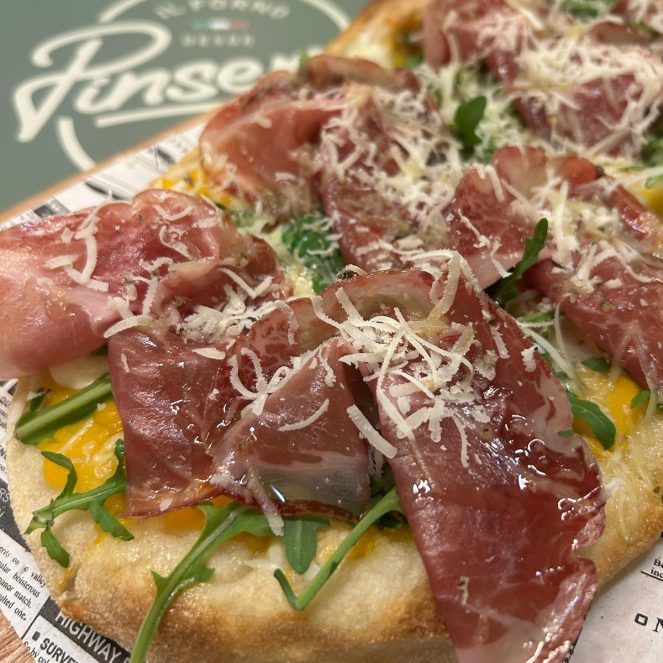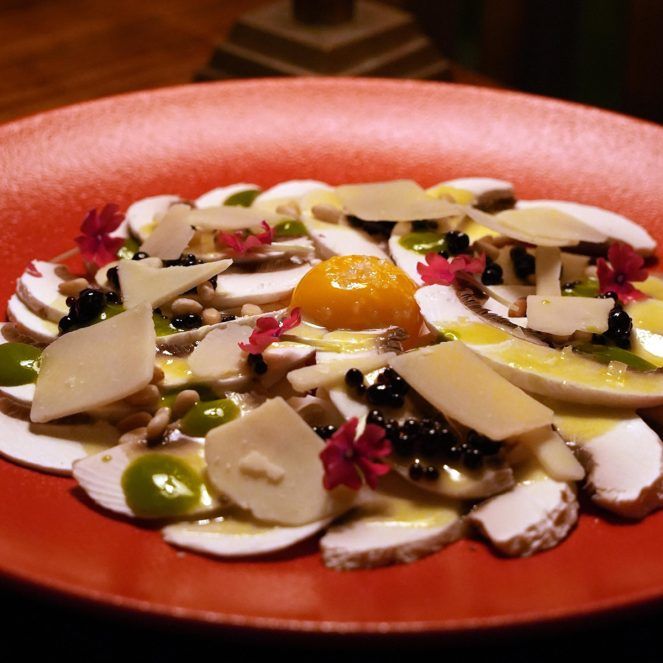 Láminas de champiñón, vinagreta de albahaca, lima, caviar de módena, lascas de parmesano, gel de albahaca, yema de huevo y piñones.