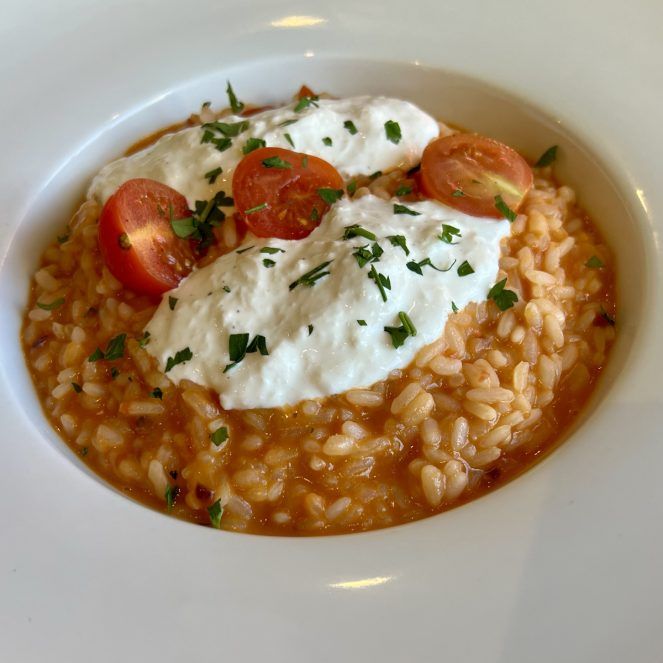 Un risotto cremoso con salsa pomodoro y burrata fresca.