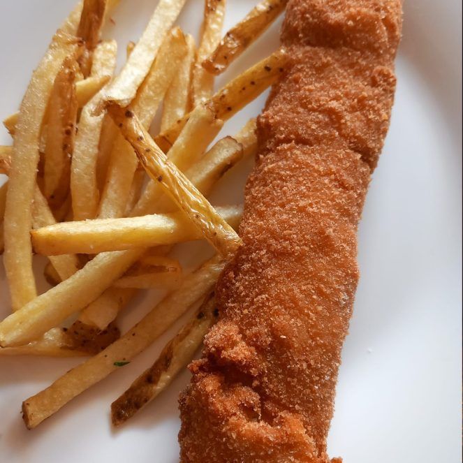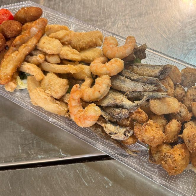 A la fritura habitual de pescado (gambas, boquerones, chocos y adobo) se le añaden las croquetas y las tiras de pollo. (Para dos personas)
