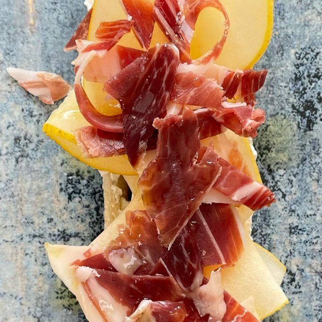 Tosta de queso crema, manzana y jamón ibérico. Acompañada de cerveza Pureza Sin gluten.