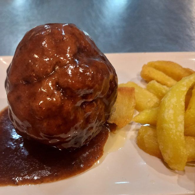 Albondigón  de 180 gr. guisado con especias holandesas en su salsa. Elaborada con carne mixta de ternera y cerdo.